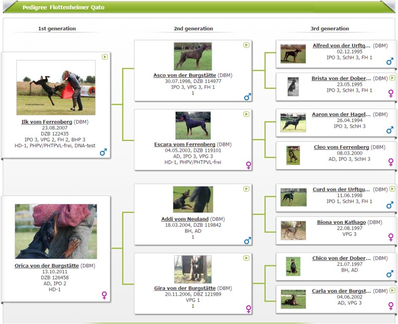 Dog Sire’s pedigree Dam’s pedigree Brista von der Doberwache 3 4 Ohra von der Weyermühle 4 4, 5 Gero von der Mooreiche 4 4, 5 Kleo von der Weyermühle 4 4, 5, 5 Gina von der Weyermühle 5, 5 5 Hertog Conan van Manensheide 5 5, 5 Hera von der Weyermühle 5 5 Asko von der Weyermühle 5 5 Cora von der Mooreiche 5 5 Amor von der Weyermühle 5 5
