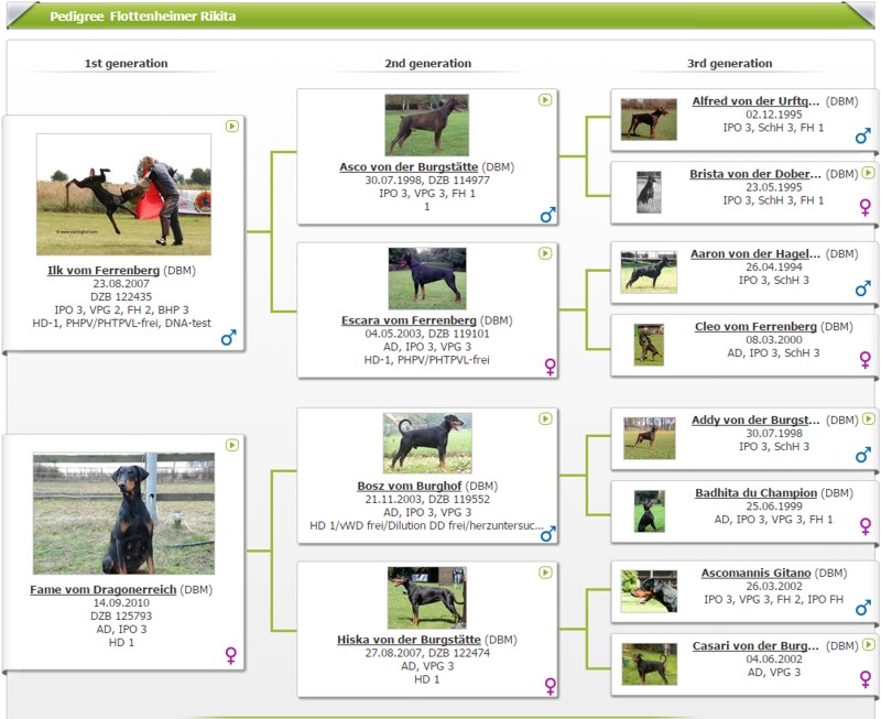 Dog Sire’s pedigree Dam’s pedigree Alfred von der Urftquelle 3 4 Brista von der Doberwache 3 4, 4 Mannix von der Weyermühle 4 5 Ohra von der Weyermühle 4 5, 5 Gero von der Mooreiche 4 5, 5, 5 Kleo von der Weyermühle 4 5, 5, 5 Gina von der Weyermühle 5, 5 5 Hertog Conan van Manensheide 5 5 Hera von der Weyermühle 5 5
